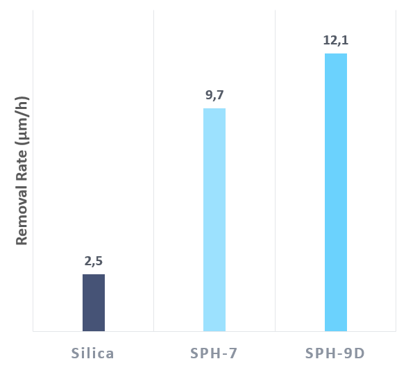 SPH series was developed to improve your productivity in sapphire polishing. These unique CMP slurries, based on patented chemical formulations, are showing 3 to 4 times quicker removal rate for sapphire C plane compared with traditional colloidal silica slurry.